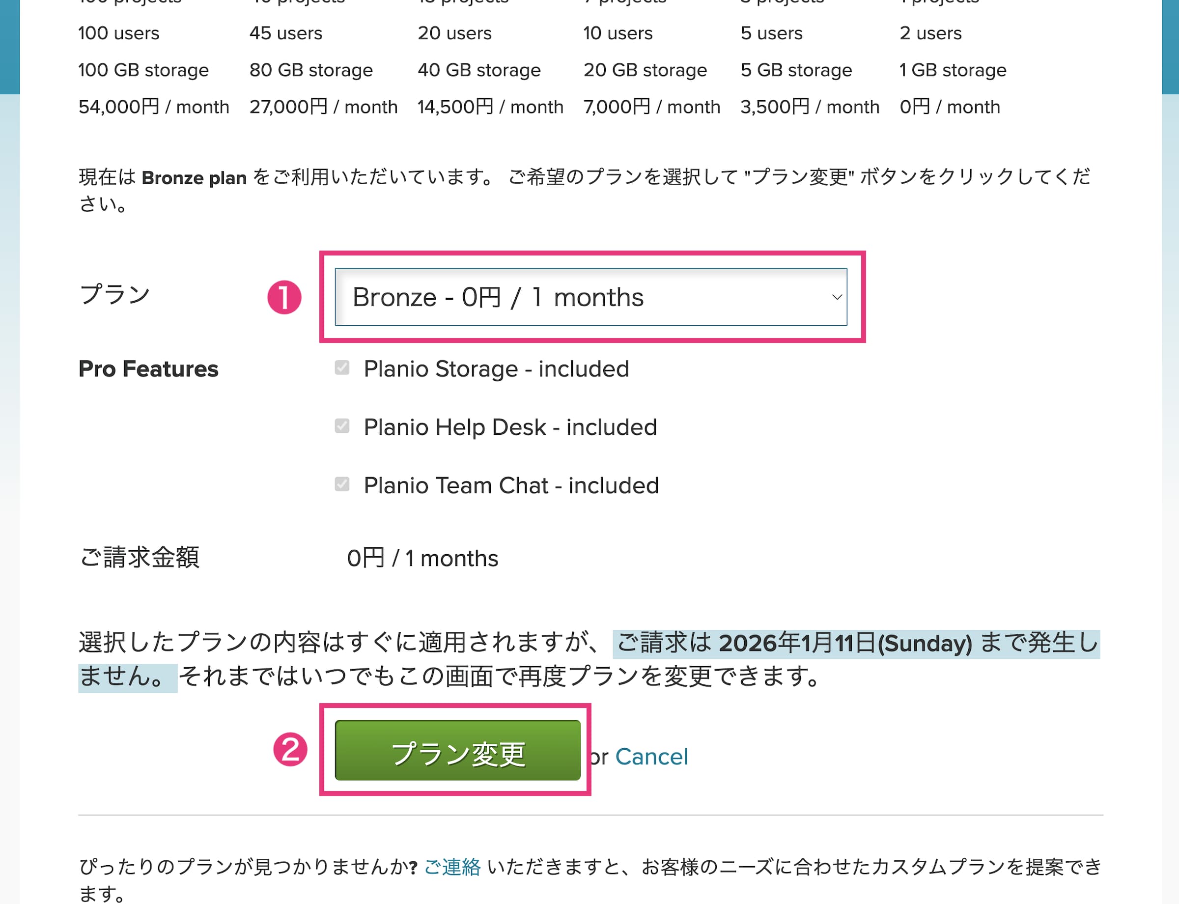 次は、トライアル期間終了後も「無料」で使い続けることのできるBronzeプランへの変更方法をご説明いたします。