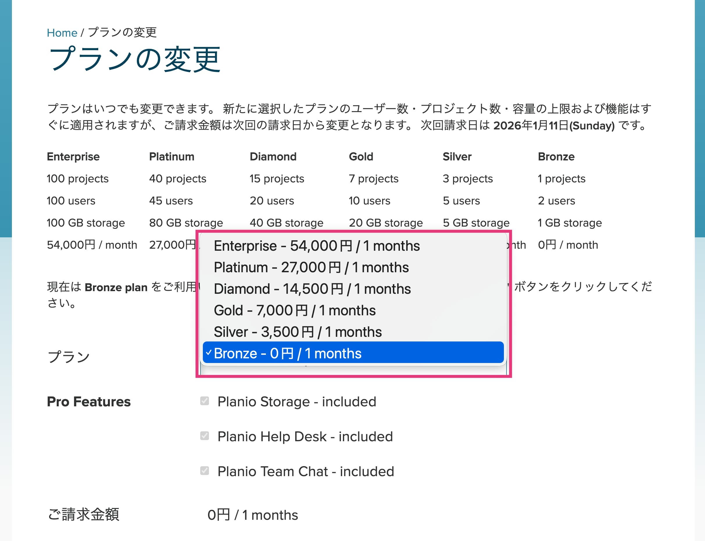プラン変更ページの料金表の下にあるプランのプルダウンの中から「Bronze - 0円 / 1 months」を選択します。
