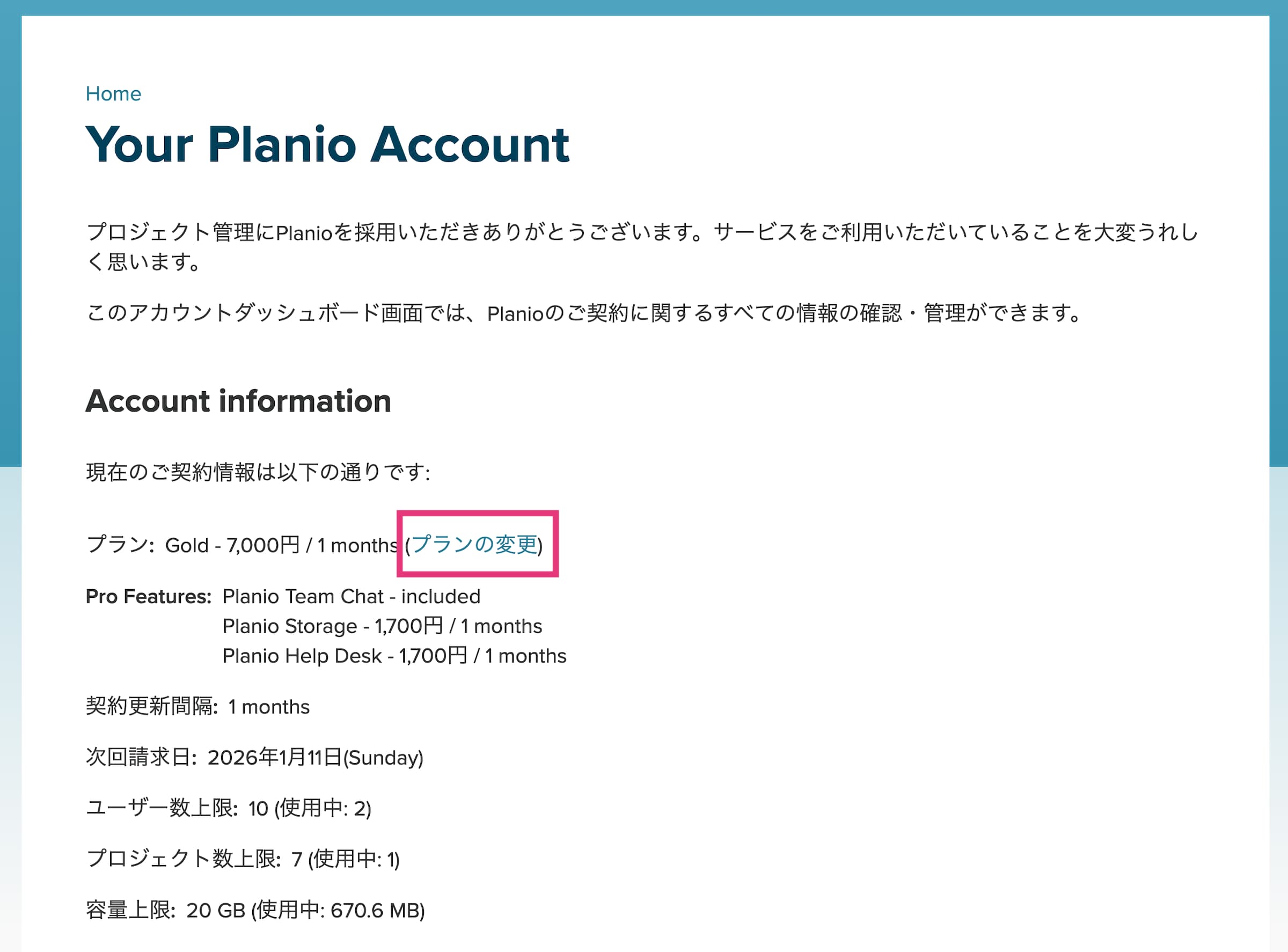 「Your Planio Account」のページが表示され、現在の契約状況が確認できます。プラン横の(プラン変更)をクリックします。